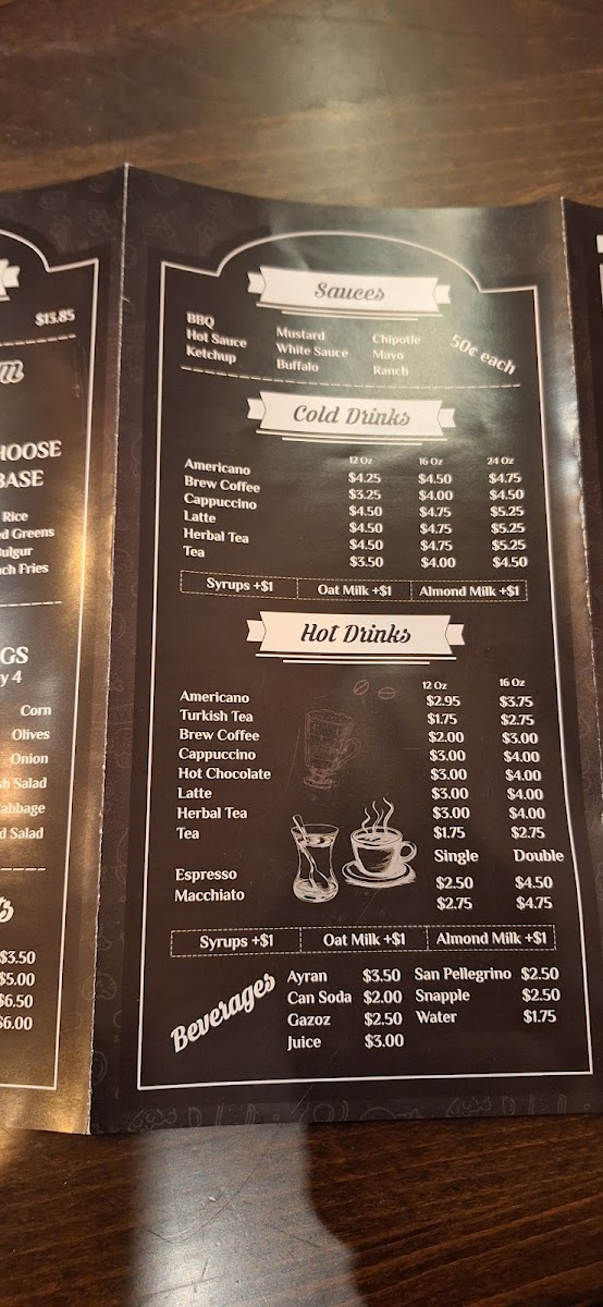 But it's not just breakfast. The All Day Signature Sandwiches include the flavorful Istanbul Classic Gyro Wrap and the mouthwatering Kofte Sandwich, sure to satisfy your cravings. For the perfect beverage, choose from their array of hot drinks like robust Americano or silky cappuccino, customizable with various milk options.